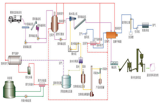 垃圾處理的步驟主要可以分為如:分揀、加熱、蒸煮壓榨、固態(tài)分離、離心分離、烘干等多個(gè)加工程序。整個(gè)過(guò)程分在預處理車(chē)間、油脂車(chē)間、生物蛋白飼料車(chē)間、污水處理車(chē)間以及廢氣處理等幾大部分進(jìn)行。