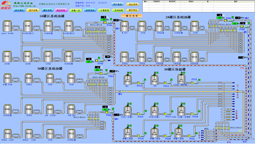 2)該系統可實(shí)現對罐區油位、溫度、油品、管路閥門(mén)、電機、攪拌機、稱(chēng)重、球掃等設備進(jìn)行智能監視控制,主要功能分布分別為:按重量和油品配方進(jìn)行基礎油管路輸送。整個(gè)過(guò)程,只需進(jìn)行中控操作,余下的都有程序自動(dòng)完成,操作簡(jiǎn)單,自動(dòng)化程度高,并且在油品轉換的時(shí)候自動(dòng)進(jìn)行管路的球掃,避免混油、串油現象。閥門(mén)、管道、油泵的狀態(tài)均有顏色變化來(lái)表示,可直觀(guān)、清晰的了解當前設備工作狀態(tài)。
